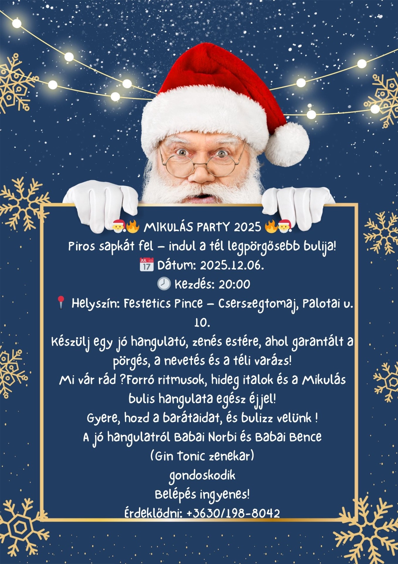 2025.12.06. Mikulás Party kicsiknek és nagyoknak18-19 óra között vendégül látjuk a település gyermekeit 0-14 éves kor között. A gyermekek ajándékot kapnak a Mikulástól.